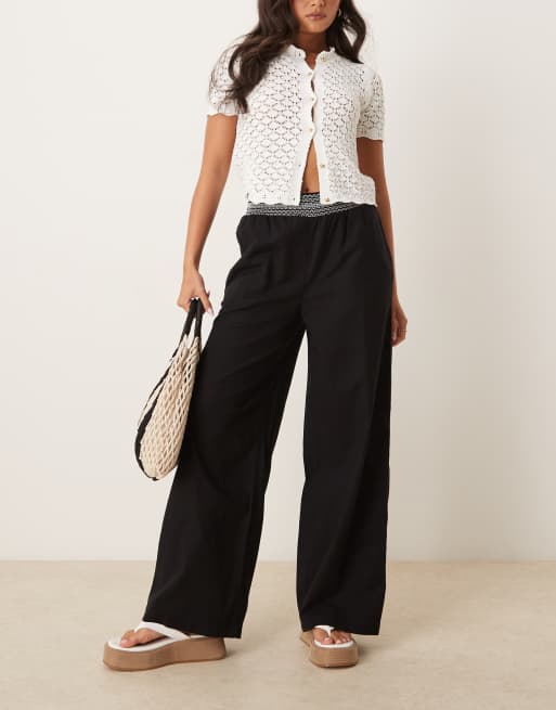 ASOS DESIGN – Schlupfhose aus Leinenmix in Schwarz mit weitem Bein und Bund mit gesmoktem Muster in Creme