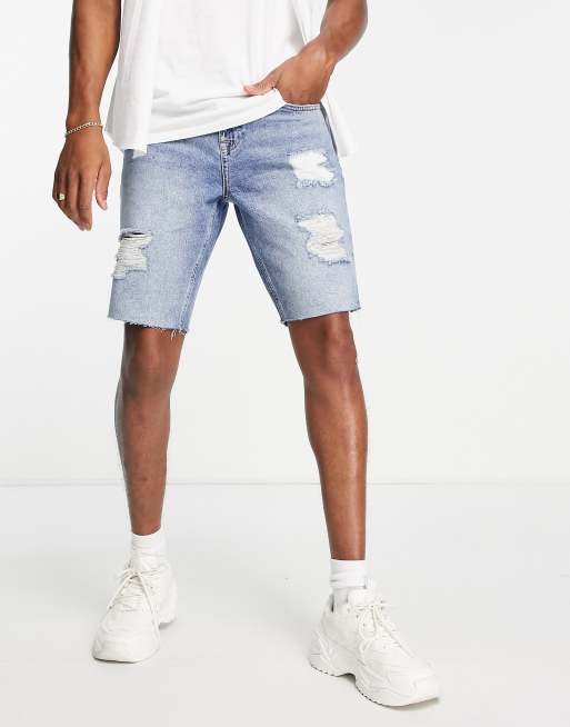 ASOS DESIGN – Schmal geschnittene Jeansshorts in verwaschenem Mittelblau mit starken Zierrissen