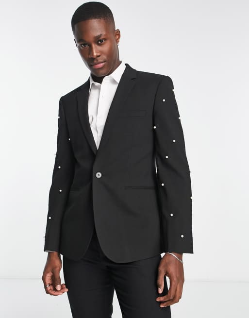 ASOS DESIGN – Schmal geschnittene Longline-Anzugjacke in Schwarz mit Perlenverzierung