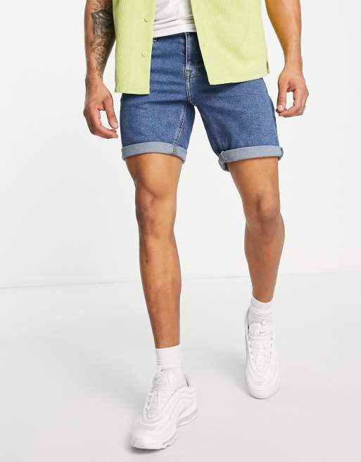 ASOS DESIGN – Schmal geschnittene, mittellange Stretch-Jeansshorts in mittelblauer Flat-Waschung