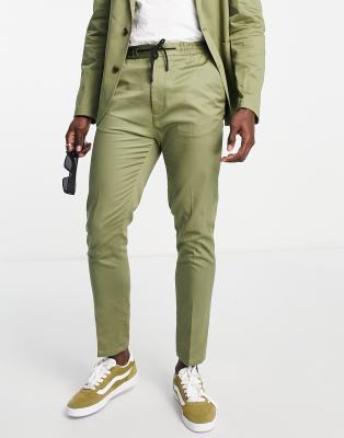 ASOS DESIGN – Schmal zulaufende Anzughose aus Baumwolle in Khaki-Grün mit Kordelzugbund und Umschlag
