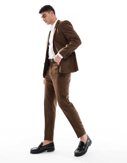 ASOS DESIGN – Schmal zulaufende Anzughose aus Wollmix in Dunkelbraun mit Bindungsmuster