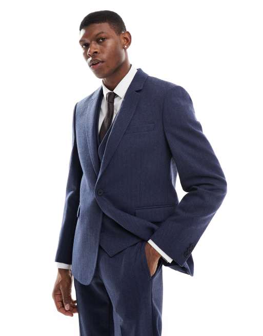 ASOS DESIGN – Schmale Anzugjacke mit Wollanteil in Blau mit Fischgrätmuster