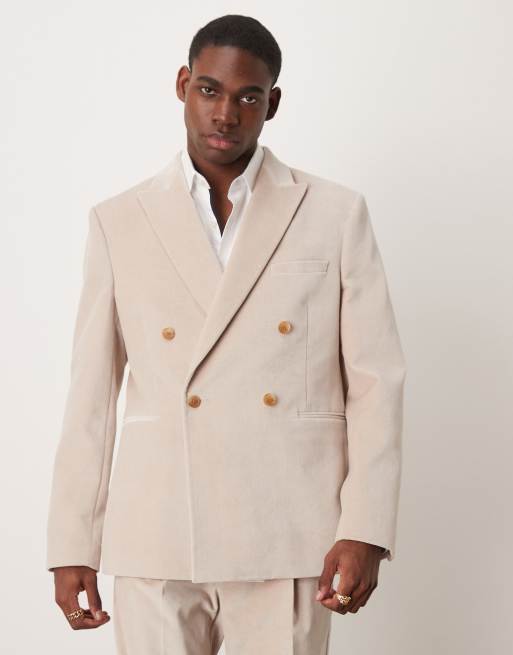 ASOS DESIGN – Schmale, zweireihige Anzugjacke aus leichtem Baumwollsamt in Steinbeige