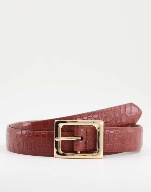 ASOS DESIGN – Schmaler Gürtel aus Kunstleder in Kroko-Burgunderrot mit goldener Schnalle