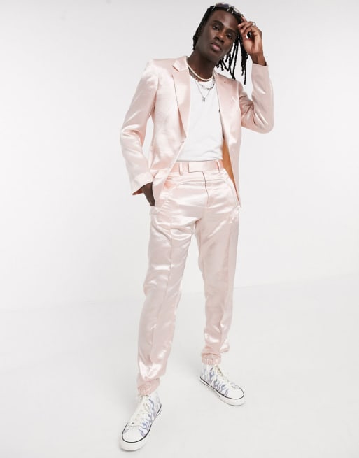 ASOS DESIGN – Schmaler, hochglänzender Anzug in Stone mit weißer Paspelierung