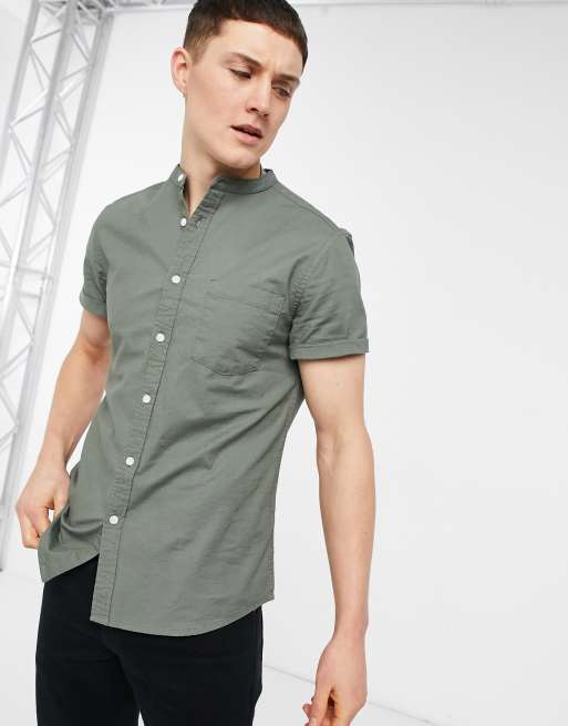 ASOS DESIGN – Schmales Oxford-Hemd mit Grandad-Kragen in Khaki