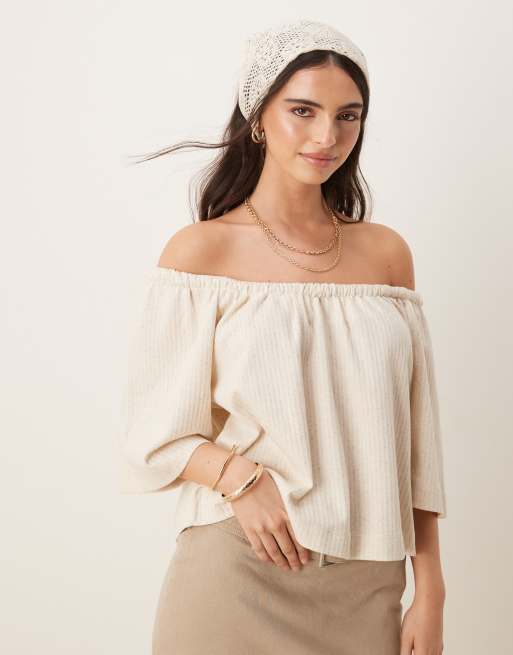 ASOS DESIGN – Schulterfreies, kurzärmliges Cropped-T-Shirt mit Streifenmuster in neutralen Farben