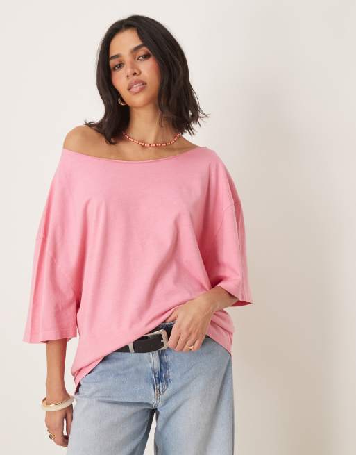 ASOS DESIGN – Schulterfreies, locker sitzendes Oversize-T-Shirt in verwaschenem Rosa