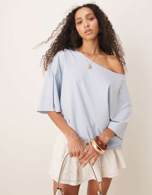 ASOS DESIGN – Schulterfreies, lockeres Oversize-T-Shirt in Babyblau