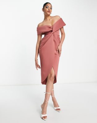 ASOS DESIGN – Schulterfreies Midikleid in Rose mit verdrehter Vorderseite