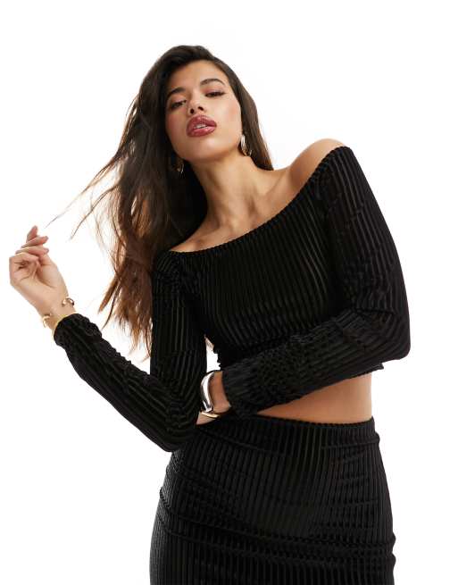 ASOS DESIGN – Schulterfreies Oberteil aus geripptem Samt in Schwarz, Kombiteil