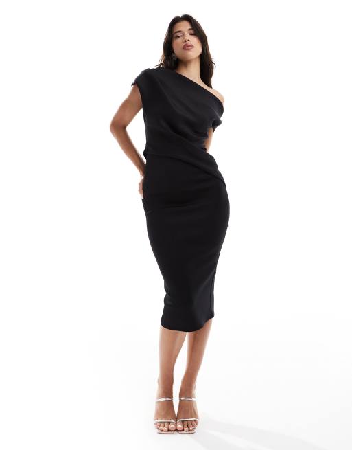 ASOS DESIGN – Schulterfreies, plissiertes Midi-Bleistiftkleid in Schwarz mit Faltendetail an der Taille