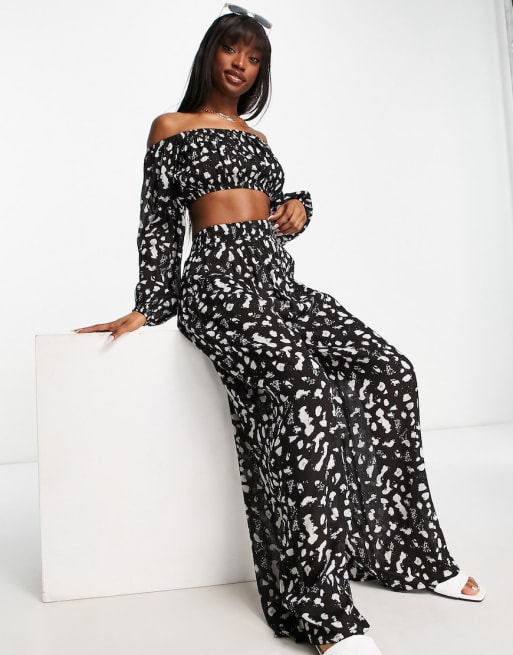 ASOS DESIGN – Schulterfreies Strand-Kombiteil in Knitteroptik mit schwarzweißem Punkteprint