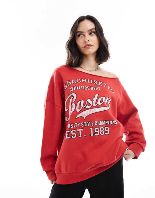 ASOS DESIGN – Schulterfreies Sweatshirt in Rot mit „Boston“-Grafik