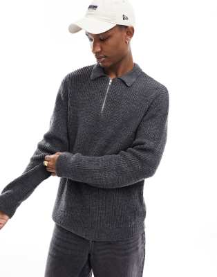 ASOS DESIGN – Schwerer, gerippter Pullover in Anthrazit mit kurzem 1/4-Reißverschluss und Kragen