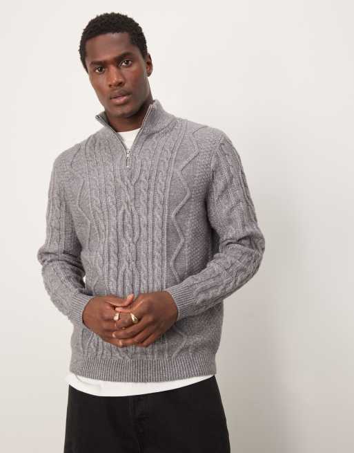 ASOS DESIGN – Schwerer Strickpullover in Anthrazit mit kurzem Reißverschluss und Zopfmuster
