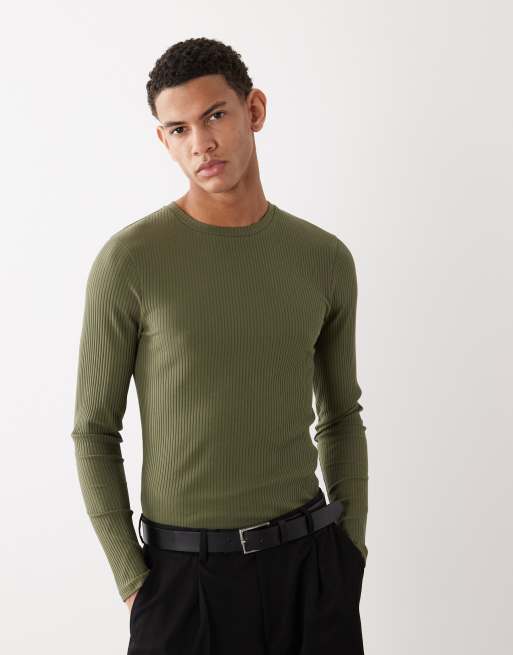ASOS DESIGN – Schweres, langärmliges Muskelshirt in Khaki mit Rippstruktur