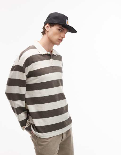 ASOS DESIGN – Schweres, langärmliges Polohemd in strukturiertem Khaki und Cremeweiß mit Streifenmuster