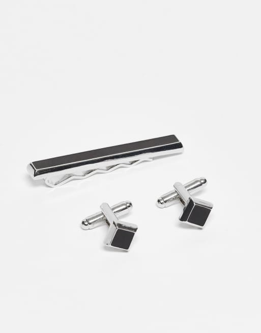 ASOS DESIGN – Set aus Krawattenspange und Manschettenknöpfen in Silberoptik mit Detail aus schwarzer Emaille