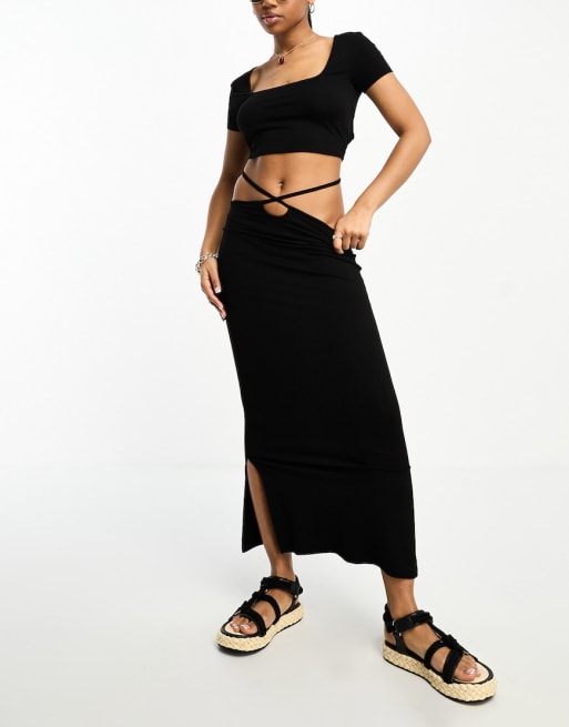 ASOS DESIGN – Set aus kurzärmligem Oberteil mit Rückenausschnitt und Midirock mit Taillenschnürung