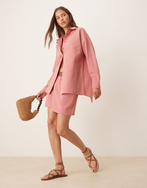 ASOS DESIGN – Set aus Seersucker in Rosé gestreift mit Hemd und Shorts mit kontrastierendem Bund