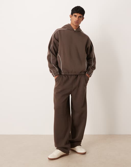 ASOS DESIGN – Set in Braun mit seitlicher Paspelierung, aus kastigem Super-Oversize-Kapuzenpullover und superweiter Jogginghose