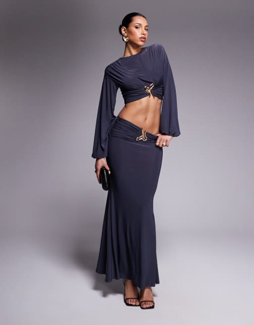 ASOS DESIGN – Set in Dunkelgrau, aus langärmligem, drapiertem Oberteil mit goldenem Detail und Maxirock