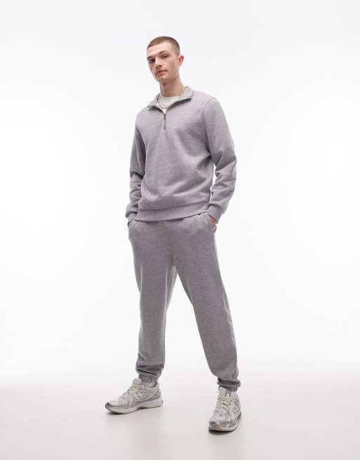 ASOS DESIGN – Set in Grau meliert mit Sweatshirt mit kurzem Reißverschluss und schmal zulaufender Jogginghose