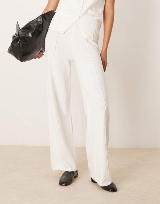 ASOS DESIGN – Set in Weiß, bestehend aus Weste mit V-Ausschnitt und Nahtdetails sowie Hose aus Strick mit weitem Bein