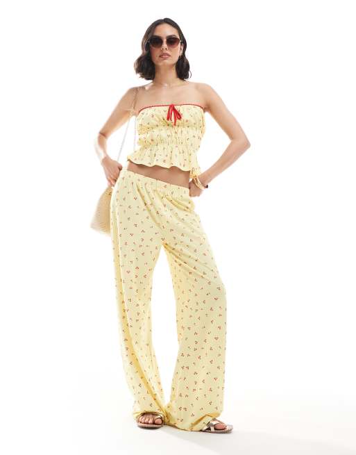 ASOS DESIGN – Set mit trägerlosem, gerüschtem Oberteil und Hose in Buttermilchgelb mit Kirschmuster