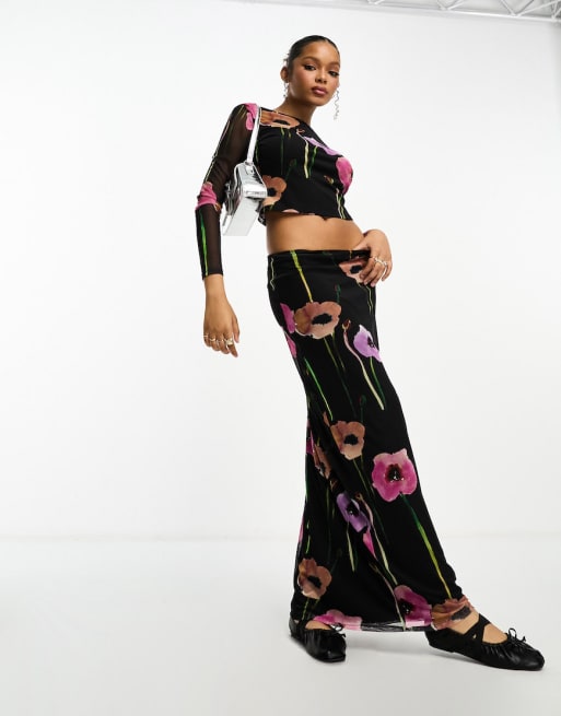 ASOS DESIGN – Set mit trägerlosem Oberteil und Maxirock aus Netzstoff mit Mohnblumenmuster