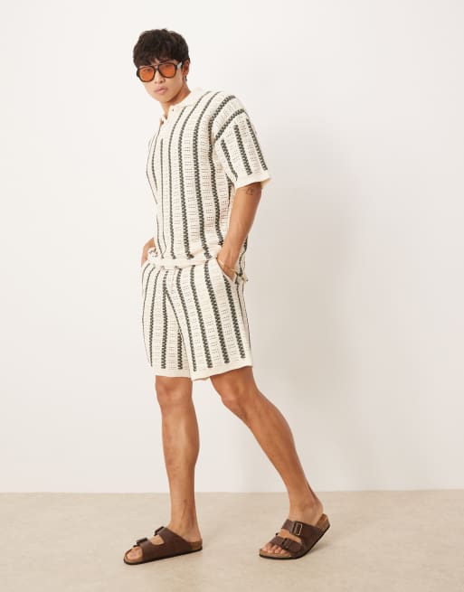 ASOS DESIGN – Shorts aus Häkelstrick in Ecru und Dunkelgrün gestreift, Kombiteil