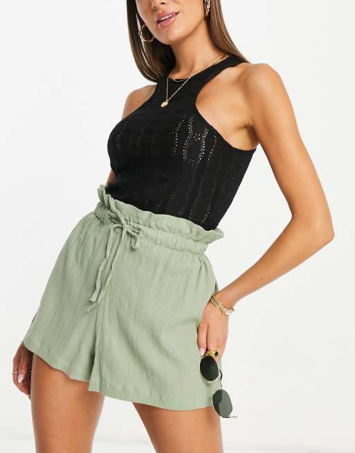ASOS DESIGN – Shorts mit Paperbag-Taille aus Knitterstoff in Salbeigrün