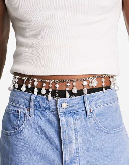 ASOS DESIGN – Silberfarbene Bauchkette mit großen Kunstperlen und Kristallanhängern