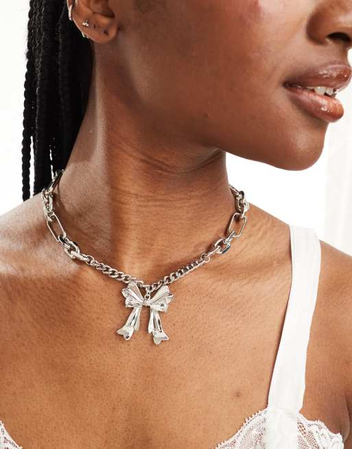 ASOS DESIGN – Silberfarbene Halskette mit verschiedenen Kettendesigns und Schleifendetail