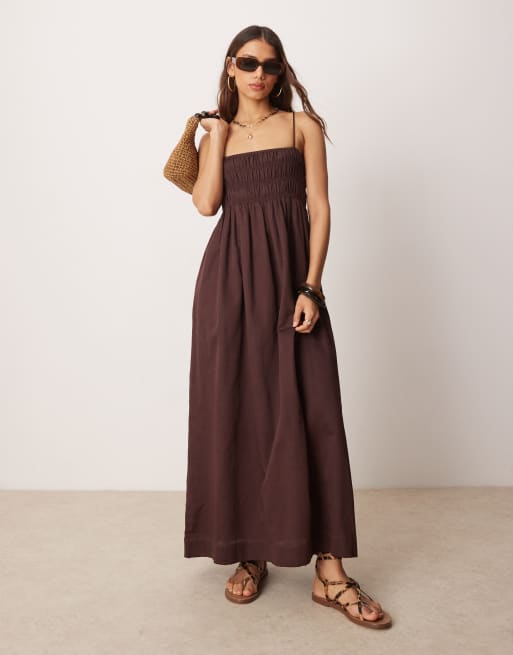 ASOS DESIGN – Sommerkleid in Maxilänge in Schokobraun aus Baumwoll-Satin mit gesmoktem Dekolleté