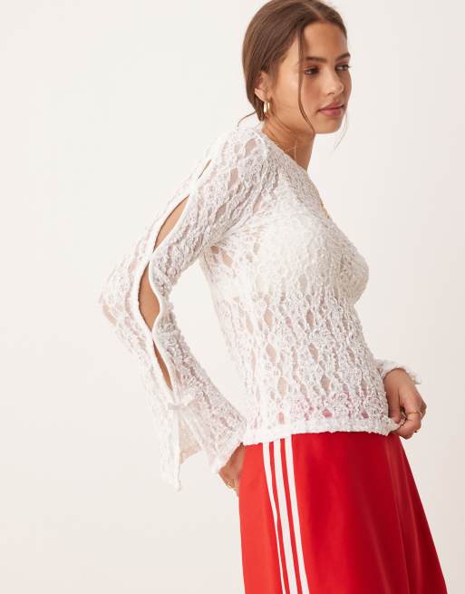 ASOS DESIGN – Spitzen-Oberteil in Elfenbeinweiß mit U-Boot-Ausschnitt und Schleifendetail