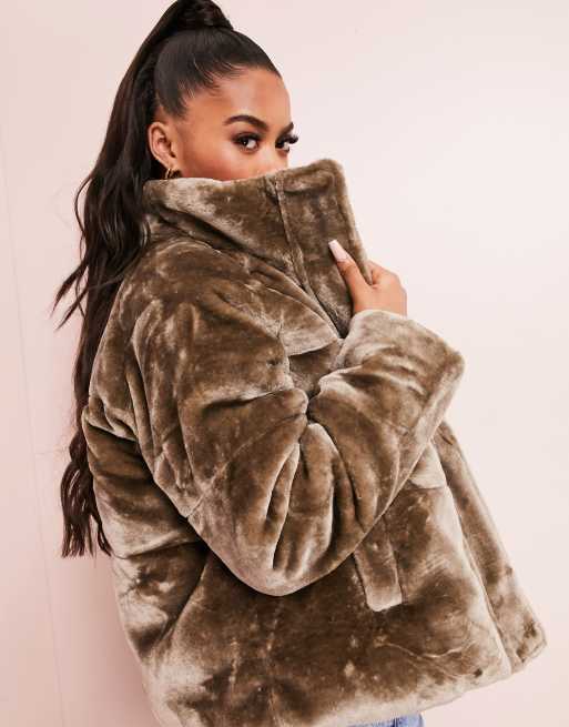 ASOS DESIGN – Steppjacke mit flauschigem Kunstpelz in Nerzbraun