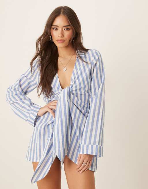 ASOS DESIGN – Strand-Hemdkleid in gestreiftem Blau mit gebundener Vorderseite
