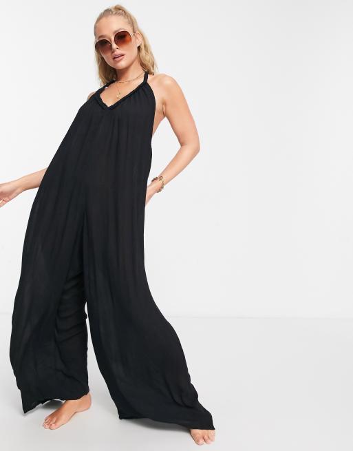 ASOS DESIGN – Strand-Jumpsuit in Schwarz in Crinkle-Optik mit weitem Bein und Flechtdetail