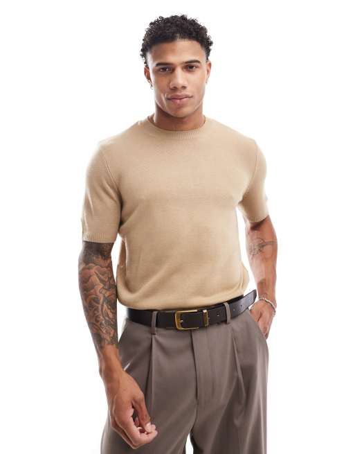 ASOS DESIGN – Strick-T-Shirt in Steinbeige mit Rundhalsausschnitt, Kombiteil