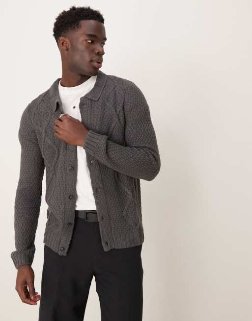 ASOS DESIGN – Strickjacke in Anthrazit mit Zopfmuster und Kragen
