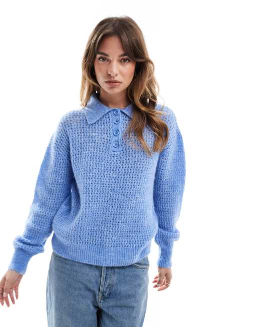 ASOS DESIGN – Strickoberteil in sanftem Blau mit Polokragen