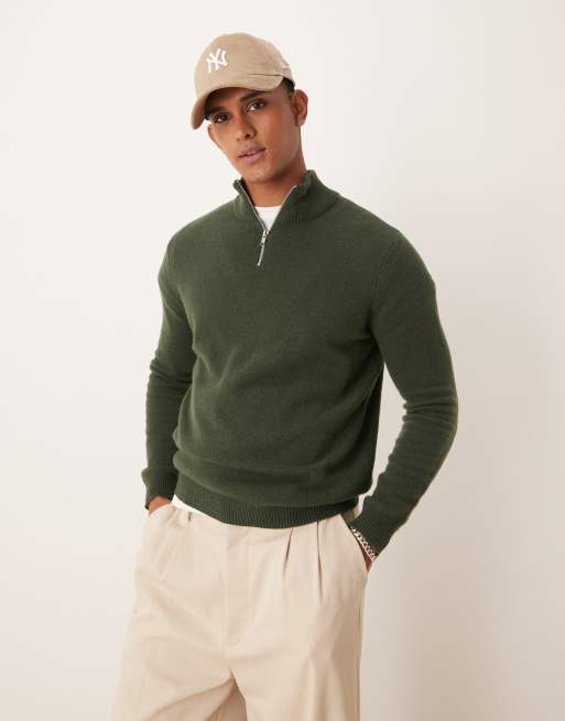ASOS DESIGN – Strickpullover aus Lammwolle in Dunkelgrün mit kurzem Reißverschluss