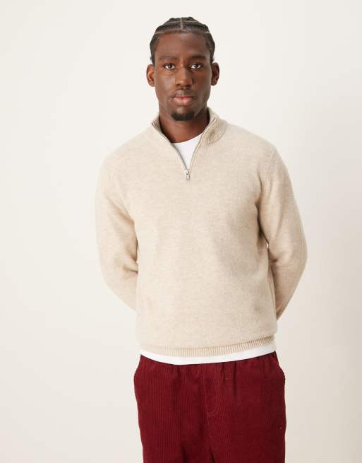 ASOS DESIGN – Strickpullover aus Lammwolle in Hellbeige mit kurzem Reißverschluss