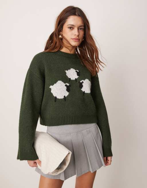 ASOS DESIGN – Strickpullover in Dunkelgrün mit Schafmotiv und weiten Ärmeln
