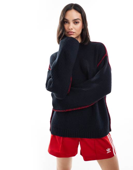 ASOS DESIGN – Strickpullover in Marineblau mit roten Languettenstichnähten