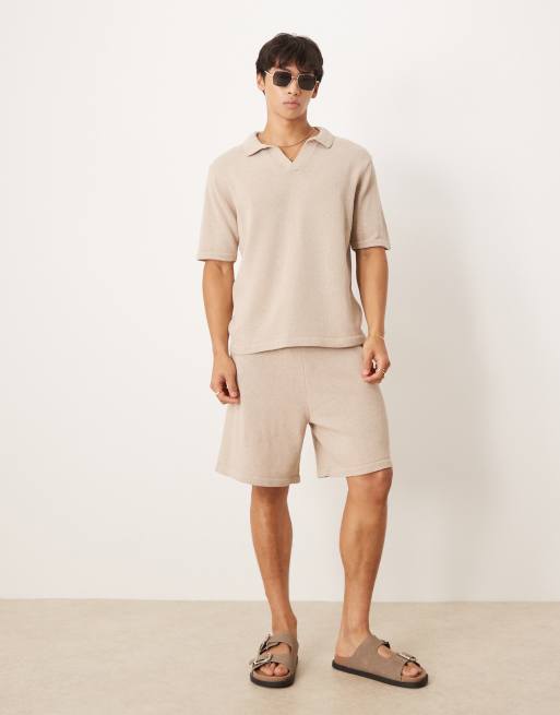 ASOS DESIGN – Strickset in Mink bestehend aus locker geschnittenem Polohemd mit eingekerbtem Ausschnitt und Shorts