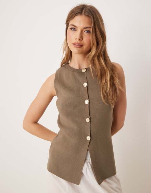 ASOS DESIGN – Strukturierte Strickweste in Mokka mit Rundhalsausschnitt und goldfarbenen Knöpfen